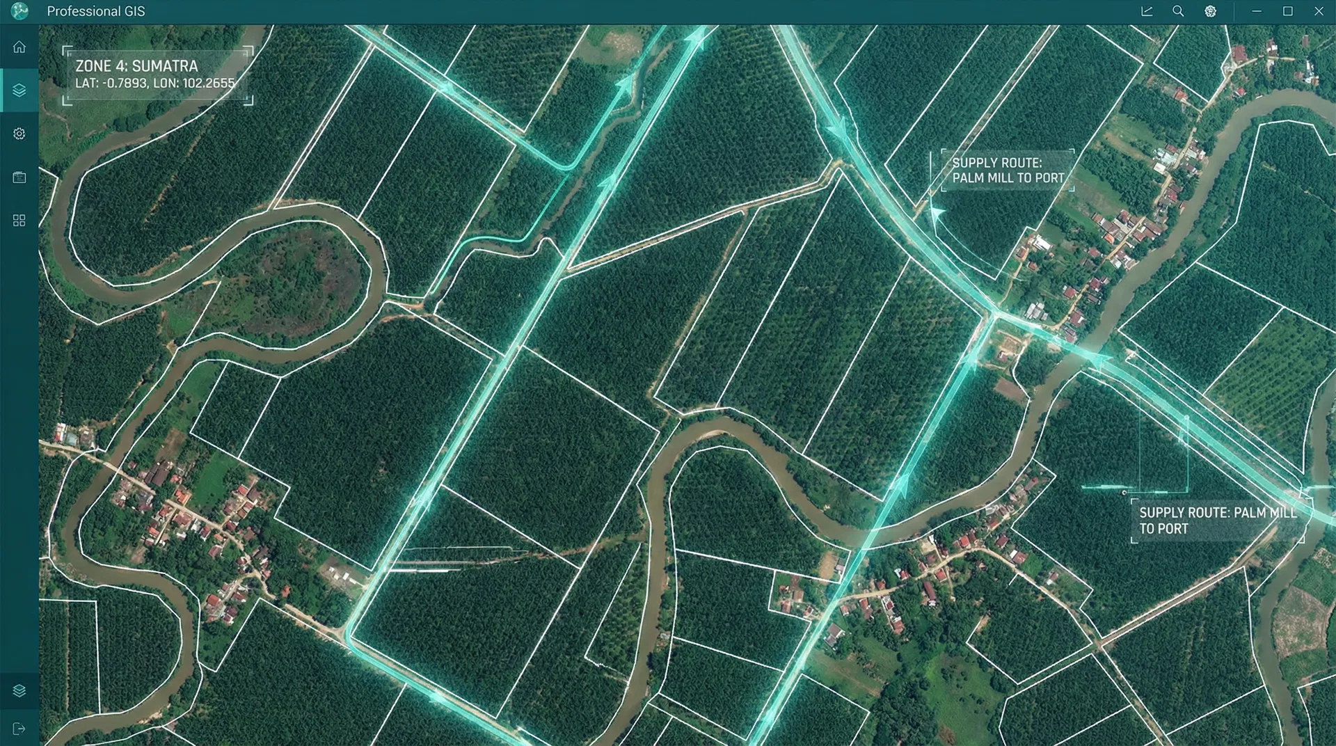 Visualisasi geospasial seluruh rantai pasok dari kebun hingga ekspor melalui peta interaktif Indonesia.